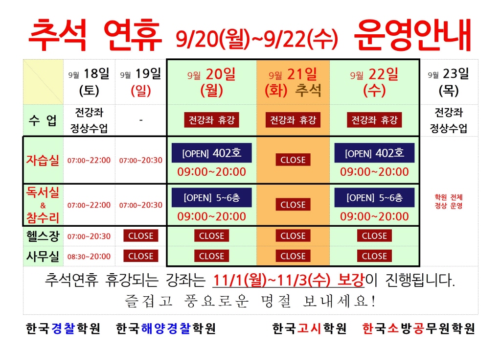 ※ [추석연휴 안내] 학원 운영 일정 안내 (강의, 자습실, 정독실 등)