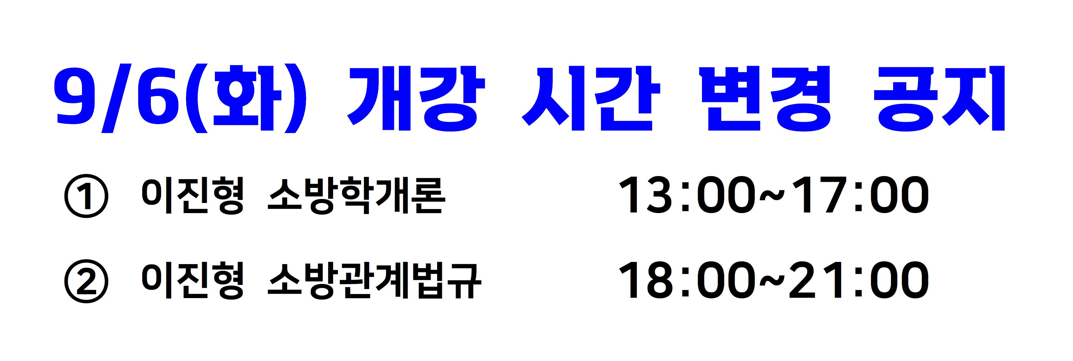 ★★9/6(화) 소방학개론&소방관계법규 개강 시간 변경 공지★★