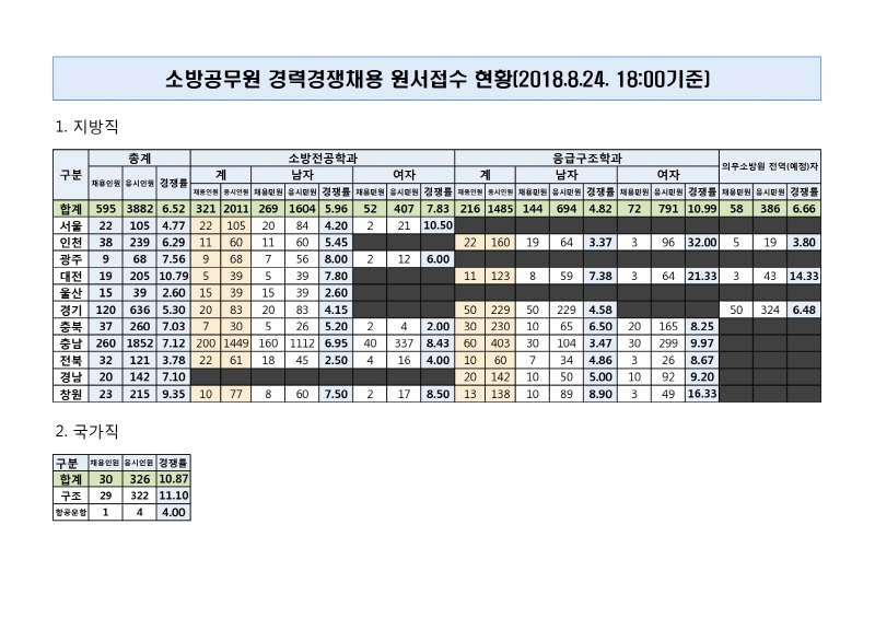 중앙소방학교에서 시행하는 소방공무원(국가직,지방직) 경력경쟁 채용시험의 원서접수 결과를 첨부합니다.